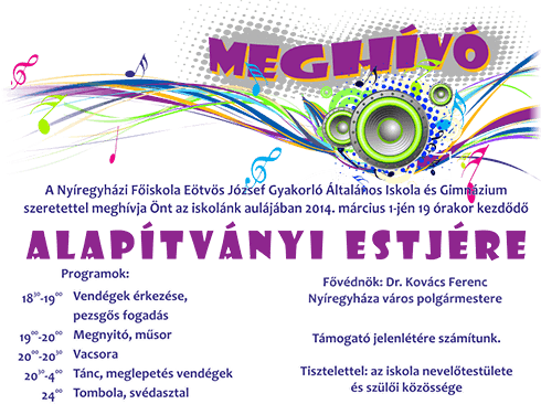 A Nyíregyházi Főiskola Eötvös József Gyakorló Általános Iskola és Gimnázium szeretettel meghívja Önt az iskolánk aulájában 2014. március 1-én 19 órakor kezdődő alapítványi estjére.
