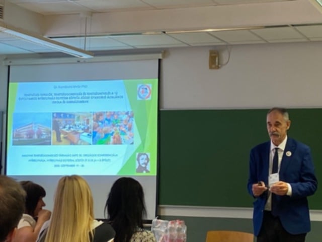 Dr. Komáromi István előadásának címe: „Tehetséges tanulók, tehetséggondozás és tehetségnevelés a 12 évfolyamos Nyíregyházi Egyetem Eötvös József Gyakorló Általános Iskola és Gimnáziumban.”
