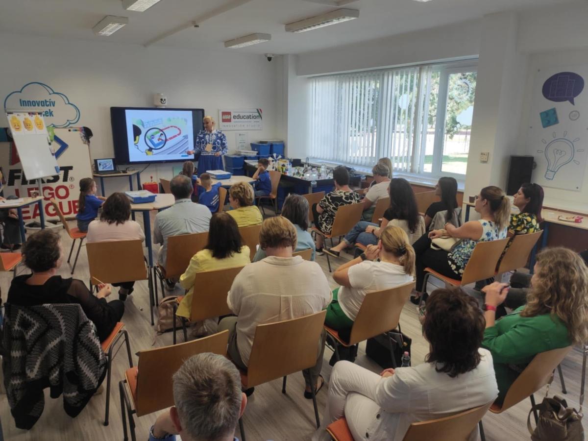 Dr. Juhászné Molnár Tünde: A Nyíregyházi Egyetem Eötvös József Gyakorló Általános Iskola és Gimnázium élménypedagógiai tantermének bemutatásával betekintést nyújtottam az iskola mindennapjaiba, valamint abba a fejlesztési környezetbe, amely játékos módon oktatja a matematikát. A szekció második része gyakorlati bemutatóval folytatódott. Másodikos tanulók bevonásával, LEGO® módszertannal végzett matematikaórát jelenítettem meg az érdeklődők számára. A HD-Matek 1-4 készlet (MoreToMath), amely kizárólag magyarországi intézményeknek készült, elősegíti a tanulók matematikai készségeinek fejlődését, kollaborációját, valamint a szövegértési feladatok mélyebb értelmezését. A gyakorlat során bevonásra került a közönség is, ezáltal még mélyebben megismerhették a módszertan fejlesztő lehetőségeit.